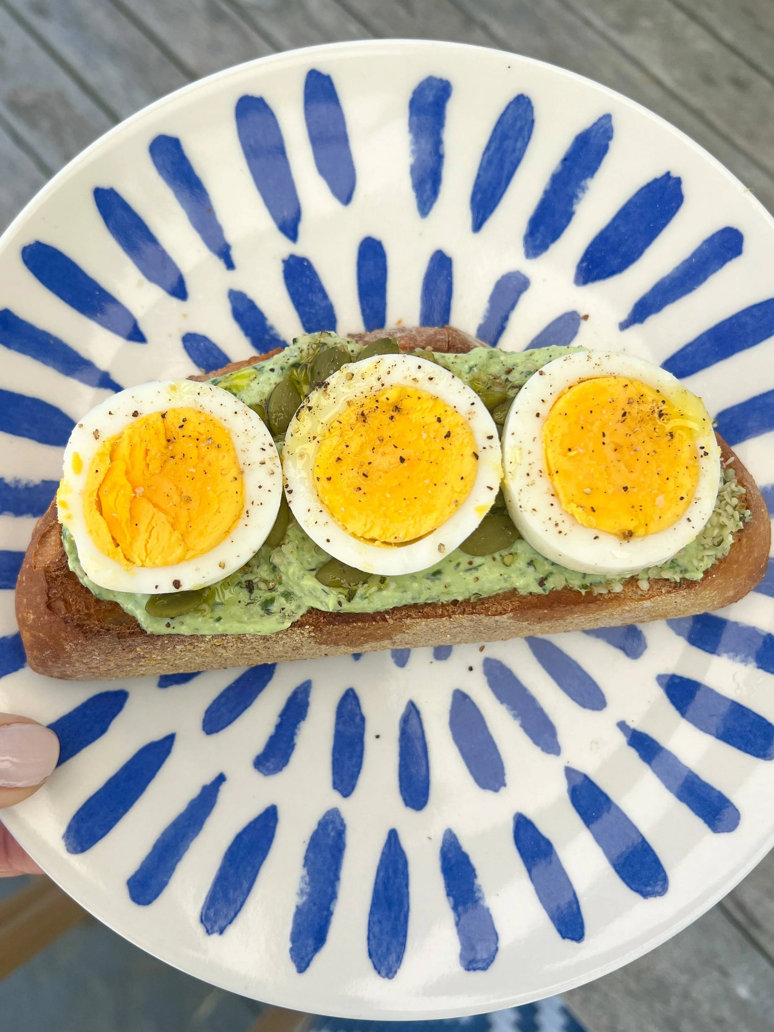 I could literally drizzle the green goddess dip on anything! To make it a little heartier and more spreadable, we blended the leftover dip with a little cottage cheese and a handful of spinach. Sprinkled with some healthy seeds and topped with a hard boiled egg. I mean…we’re soooooo healthy ;)