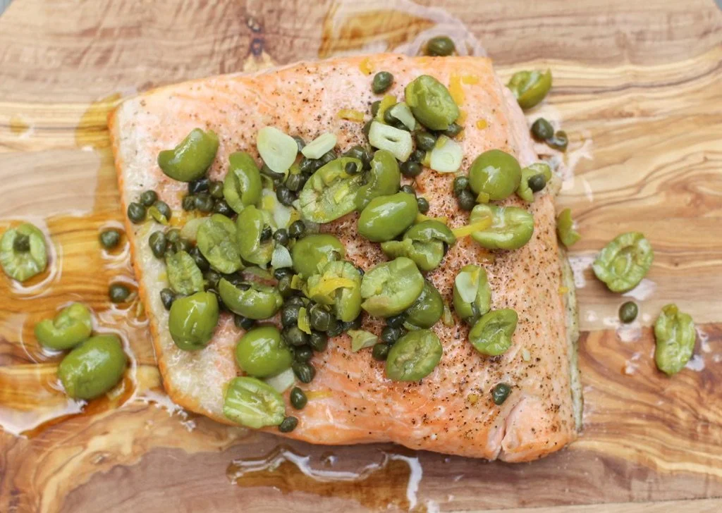 Sizzled Skin Salmon with Sizzled Olives
