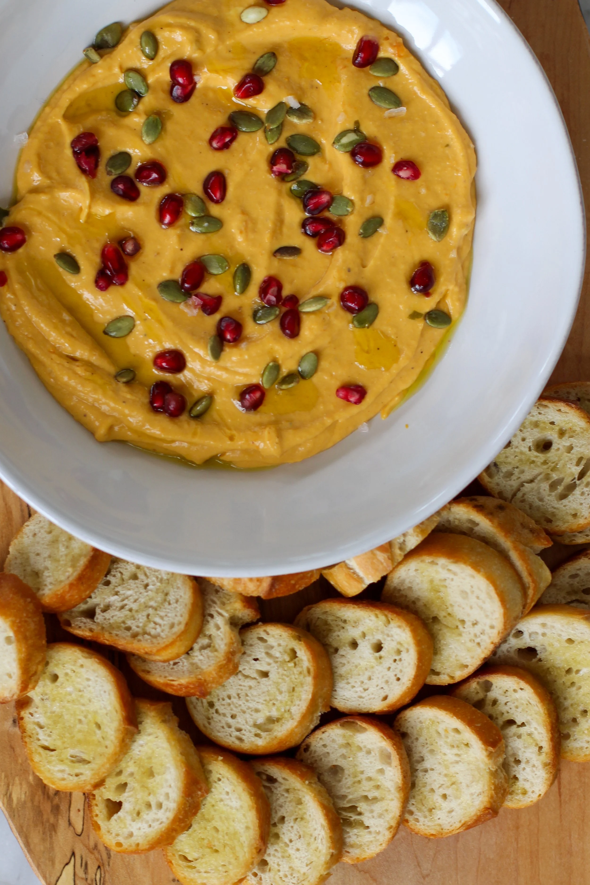 Spoon the mixture into a shallow serving bowl. Top with pumpkin seeds, pomegranate seeds, a drizzle of olive oil, and a pinch of flaky salt.